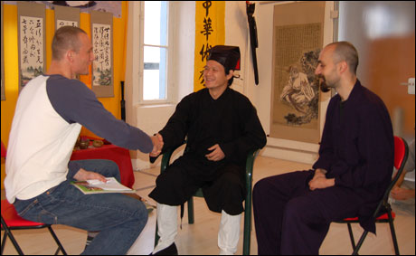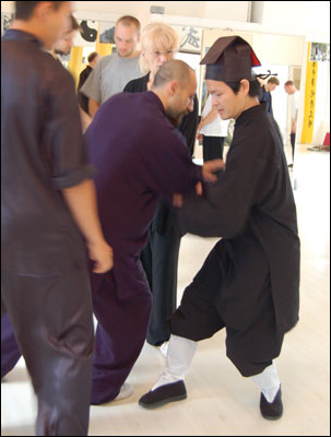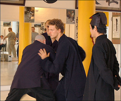 ![]() Meister Tang Li Long beoabachtet eine Partnerübung beim Seminar in der Berliner Akademie der Kampfkünste Foto: Anna Homburg |