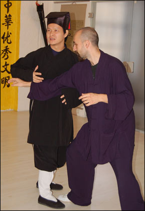 ![]() Meister Tang Li Long und Ismet Himmet bei der Demonstration eines Prinzips aus dem Wudang Pai Foto: Anna Homburg |