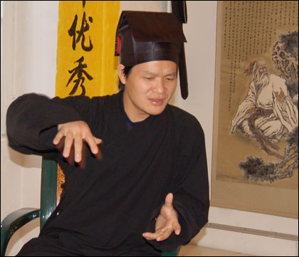 KFSB: Was gibt es zu den anderen Trainingsbereichen traditioneller Kampfkunst zu sagen? Welche Rolle spielen Partnerarbeit (Dui Lian) und Freikampf-Übungen (San Shou) im Wudang Pai? Meister Tang: All diese Bereiche des Trainings sind wichtig. Um Wudang-Kampfkunst zu meistern, muß neben Tao Lu auch Dui Lian und San Shou praktiziert werden. KFSB: Ab wann sollte ein Schüler beginnen, Freikampf zu üben? Meister Tang: Voraussetzung für sinnvolles Freikampf-Training ist erstens, daß der Schüler sicher stehen kann. Das heißt, er muß die Verwurzelung im Boden beherrschen. Zweitens sollte ein Schüler, der mit Freikampf beginnen möchte, über eine gewisse Bewegungsgeschmeidigkeit verfügen. Verwurzelung und Geschmeidigkeit werden durch Qigong erworben. Die Freikampf-Übung sollte eine natürliche Fortsetzung oder Weiterentwicklung der Partner-Übungen (Dui Lian) sein. KFSB: Welchen Stellenwert besitzt die spirituelle Schulung im Wudang Pai? Meister Tang: Traditionell gehörte die daoistische Philosophie untrennbar zur Wudang-Kampfkunstausbildung. Jeder, der Wudang-Kampfkunst erlernen wollte, wurde auch in der daoistischen Lehre geschult. Das hing natürlich auch mit der Tatsache zusammen, daß Wudang-Kampfkunst ausschließlich im Wudang-Kloster gelehrt wurde. Heute verhält es sich anders. Wudang-Kampfkunst wird auch außerhalb des Klosters unterrichtet. Man muß heute kein Daoist sein, um Wudang-Pai üben zu können. Aber natürlich schauen sich die Lehrer sehr genau den Charakter ihrer Schüler an, um zu entscheiden, ob man sie in der Wudang-Kampfkunst unterrichten kann. |