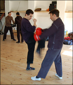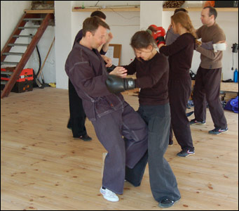 die Teilnehmer den Kniestoß zum Bauch des Gegners trainierten. Andererseits